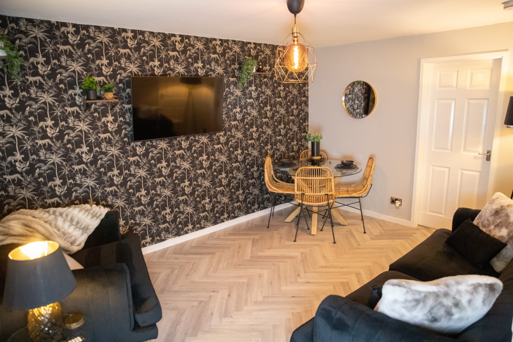 The house is fully equipped with a brand new kitchen, a comfortable living room with a 4 seater sofa, cuddle chair, and a 50 inch smart TV.